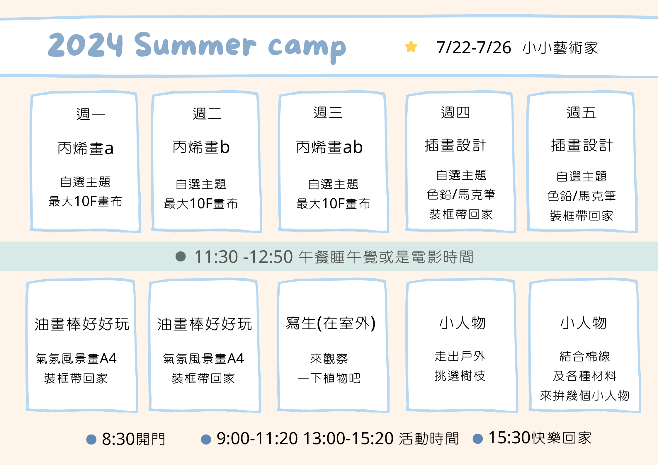 「歡迎至粉專索取作品及活動示意圖參考」 活動前,老師會進行技法示範並使用影片講解,讓學員對課程活動有概念,零基礎也不需要擔心喔 ! 會考慮學員本身的學習條件及經驗做出對應的指導及主題篩選,一起來上課變得更厲害吧 全日費用 : 4500 (餐費另計)/共完成六件作品 半日費用 : 2500/共完成三件作品 一梯十人滿(兩位老師)